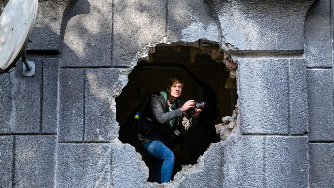 Fotograf u ratnoj zoni gleda kroz rupu probijenu u zidu