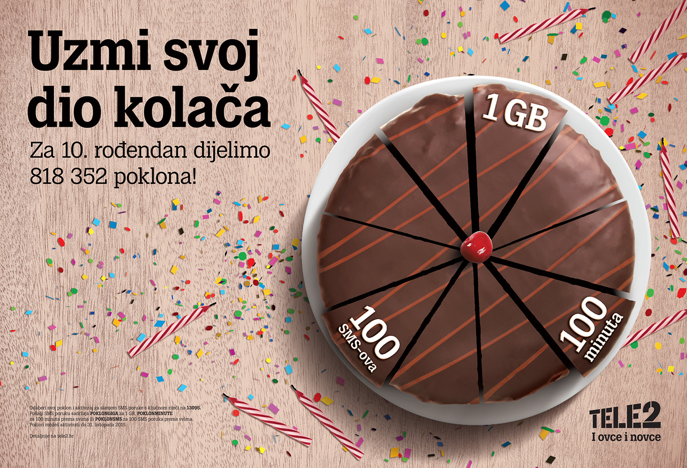 Bonaši svoj poklon mogu koristiti 30 dana od dana aktivacije, a pretplatnici svoj poklon mogu koristiti do kraja mjeseca listopada. Ključne riječi za SMS aktivaciju rođendanskih poklona na broj 13095 su: POKLONGIGA za 1 GB podatkovnog prometa, POKLONSMS za 100 SMS poruka i POKLONMINUTE za 100 minuta razgovora. Rođendanska promocija može se aktivirati do 31.10.2015. a više informacija možete naći na www.tele2.hr.