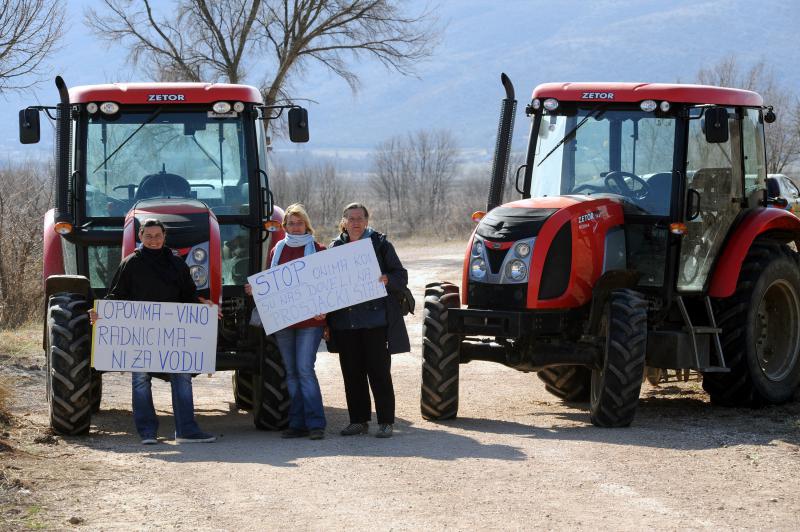 Radnici drniškog pogona Dalmacijavina traktorima su zapriječili prolazak direktorima i predstavnicima sindikata iz Splita prema plantažnim vinogradima u Petrovom polju, ogorčeni jer im Uprava prijeti otkazima iako im duguje pet plaća, a devet godina ne uplaćuje obvezne doprinose.