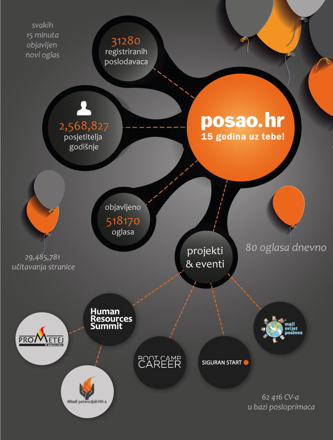 Treba vam veza za posao? Tu smo za vas već 15 godina. Objavili smo više od pola milijuna oglasa, čak 31280 registriranih poslodavaca upravo preko našeg specijaliziranog portala traži potencijalne kandidate, a  godišnje nas pretraži  dva i pol milijuna posjetitelja!