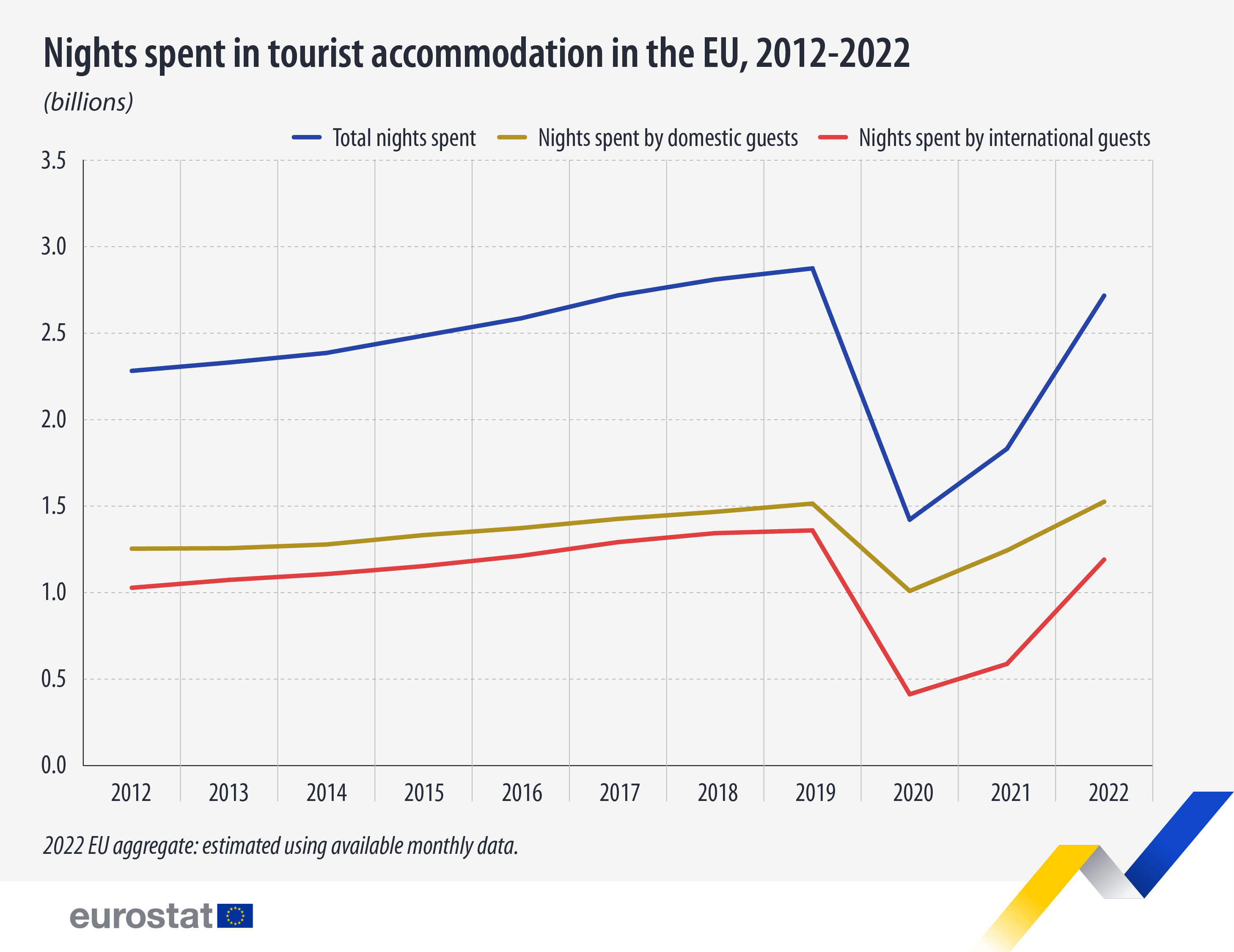 Čini se da se turistička industrija EU-a snažno oporavlja od pandemije COVID-19. Ukupan broj noćenja u turističkom smještaju u 2022. bio je blizu razine prije pandemije (2,72 milijarde noćenja u 2022. u usporedbi s 2,88 milijardi u 2019.; -5,6%). To predstavlja znatna povećanja u usporedbi s brojem noćenja 2020. i 2021. (1,42 milijarde 2020., 1,83 milijarde 2021.; +91,1% odnosno +48,3% 2022.).