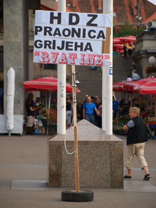 Na Trgu bana Jelačića u Zagrebu Građanska akcija postavila je tuš za ispiranjen grijeha HDZ-a. Nakon jučerašnjeg transparenta s pitanjem "Jaco, može li i Drobac doći u tvoj stan" danas su nastavili satirički kritizirati vladajuću stranku i premijerku Jadranku Kosor, piše javno.hr