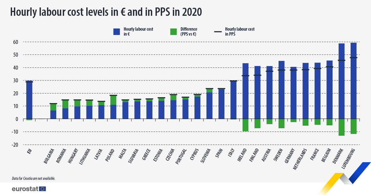 U 2020. najveći troškovi rada po satu među članicama EU-a, izraženi u eurima, zabilježeni su u Luksemburgu (47,7 €), Danskoj (45,7 €) i Belgiji (40,5 €), a najniži u Bugarskoj (6,6 €), Rumunjskoj (8,2 €) i Mađarska (9,8 €).