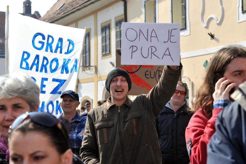 Osim Vlade, kritizirali su i aktualnu gradsku vlast, pa se među transparentima moglo uočiti i onih s porukama "Grad baroka bez Čehoka" i "Dolje s HDZ-ovim vazalima". (Hina)