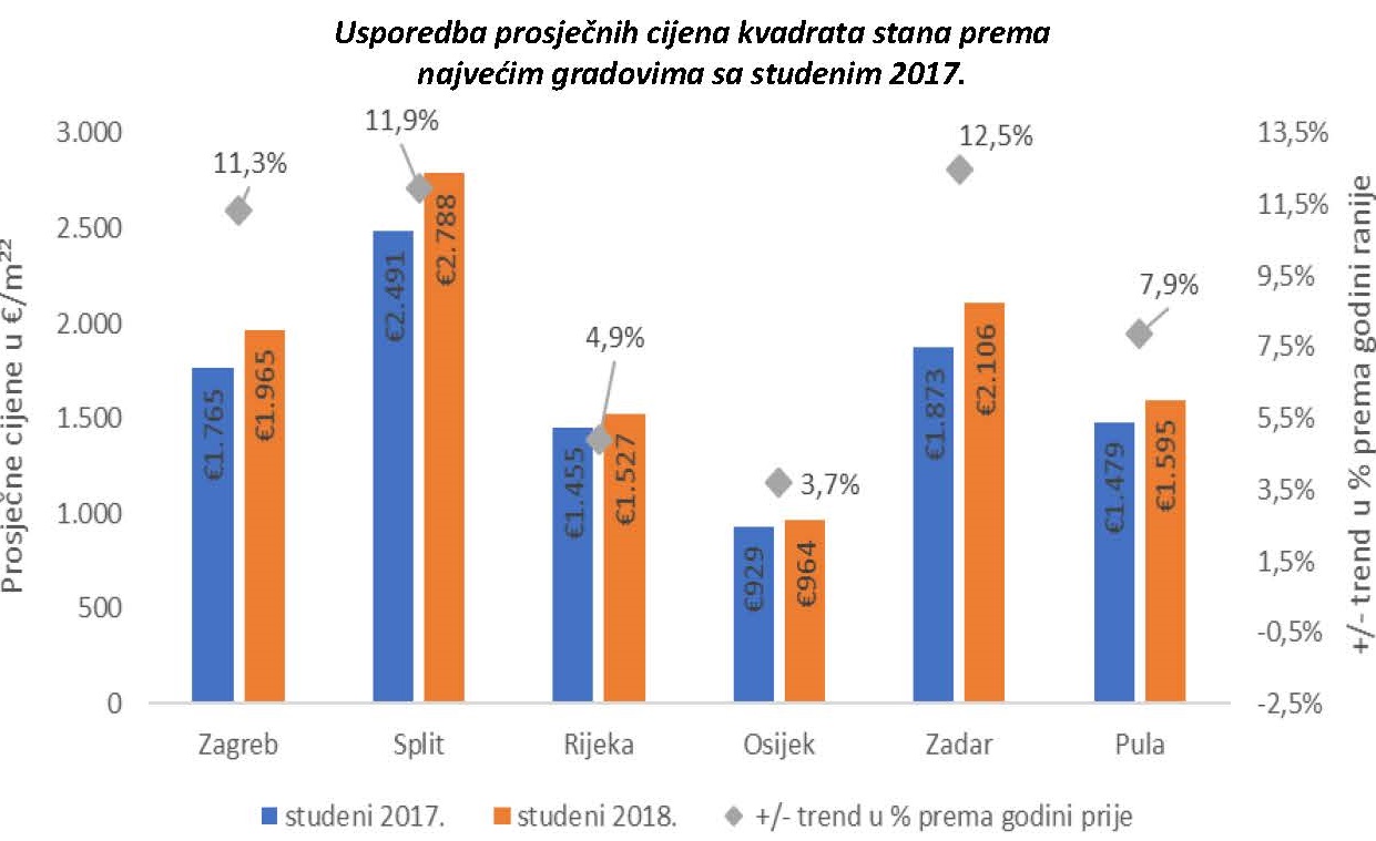 U Zagrebu potencijalni kupci najviše pregledavaju stanove veličine između 50 i 60 kvadrata, te cijene između 60 i 80 tisuća eura, a prosječna tražena cijena za kvadrat stana iznosi 1.965 eura, i za 11 posto je viša u odnosu na isti mjesec prošle godine. Od većih gradova, Split i Zadar bilježe rast cijena stanova za čak 12 posto u odnosu na prošlu godinu, pa je tako u Splitu prosječna tražena cijena po kvadratu stana 2.788 eura, dok je u Zadru ona 2.106 eura. Od ostalih većih gradova, Pula bilježi rast cijena stanova od 8 posto, Rijeka od 5 posto, dok Osijek bilježi rast od gotovo 4 posto.