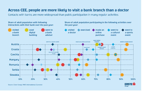 Kao glavni razlog dolaska u poslovnice ispitanici u Hrvatskoj navode korištenje usluga šalterskog službenika (81%), korištenje bankomata (77%) te razgovor sa savjetnikom (12%). Trend posjećivanja poslovnica vidljiv je i u ostatku regije pa su gotovo svi ispitanici izjavili da su posjetili poslovnicu banke u proteklih dvanaest mjeseci. Osim toga, istraživanje je pokazalo da je na svim tržištima SIE regije vjerojatnije da je osoba posjetila poslovnicu banke nego liječnika u proteklih dvanaest mjeseci.