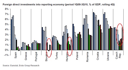 Nakon velikog pada u 2009. (-45% na godišnjoj razini), započeo je oporavak izravnih stranih ulaganja (godišnji rast od oko 9%). Najoptimističniji rezultati zabilježeni su u Češkoj, gdje je priljev stranih ulaganja više nego udvostručen u 2010. te je dosegnuo najvišu razinu u regiji. Dobre su vijesti stigle i iz Mađarske, gdje je negativni trend zaustavljen po prvi put nakon krize, te Slovačke i Ukrajine. Također primjećujemo da su tržišta korak ispred agencija za kreditni rejting te su već prepoznala snažne fundamentalne pokazatelje u SIE: premije za rizik (CDS spreads) su manje od onih u južnoeuropskim zemljama - komentira Juraj Kotian, suvoditelj Odjela za makroekonomska istraživanja Erste Group.