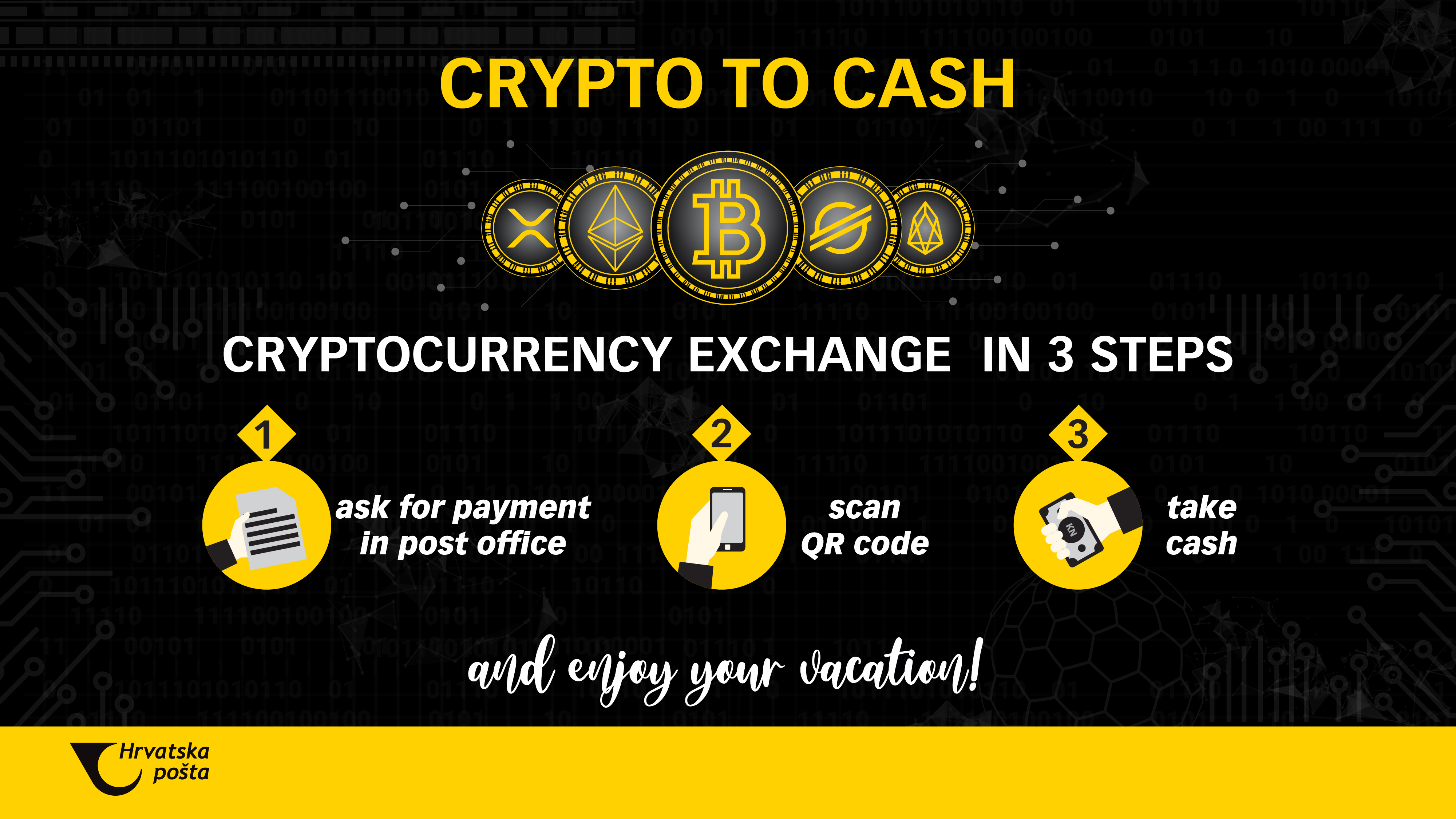 Od 15. srpnja svi domaći i strani korisnici svoje kriptovalute mogu promijeniti u kune u zadarskim poštanskim uredima, u nekoliko jednostavnih koraka. Nakon podnošenja zahtjeva skenira se QR kod te u poštanskom uredu dobivate gotovinu. Trenutačno je moguće zamijeniti pet najčešće korištenih kriptovaluta (Bitcoin, Ethereum, Stellar, Ripple i EOS).