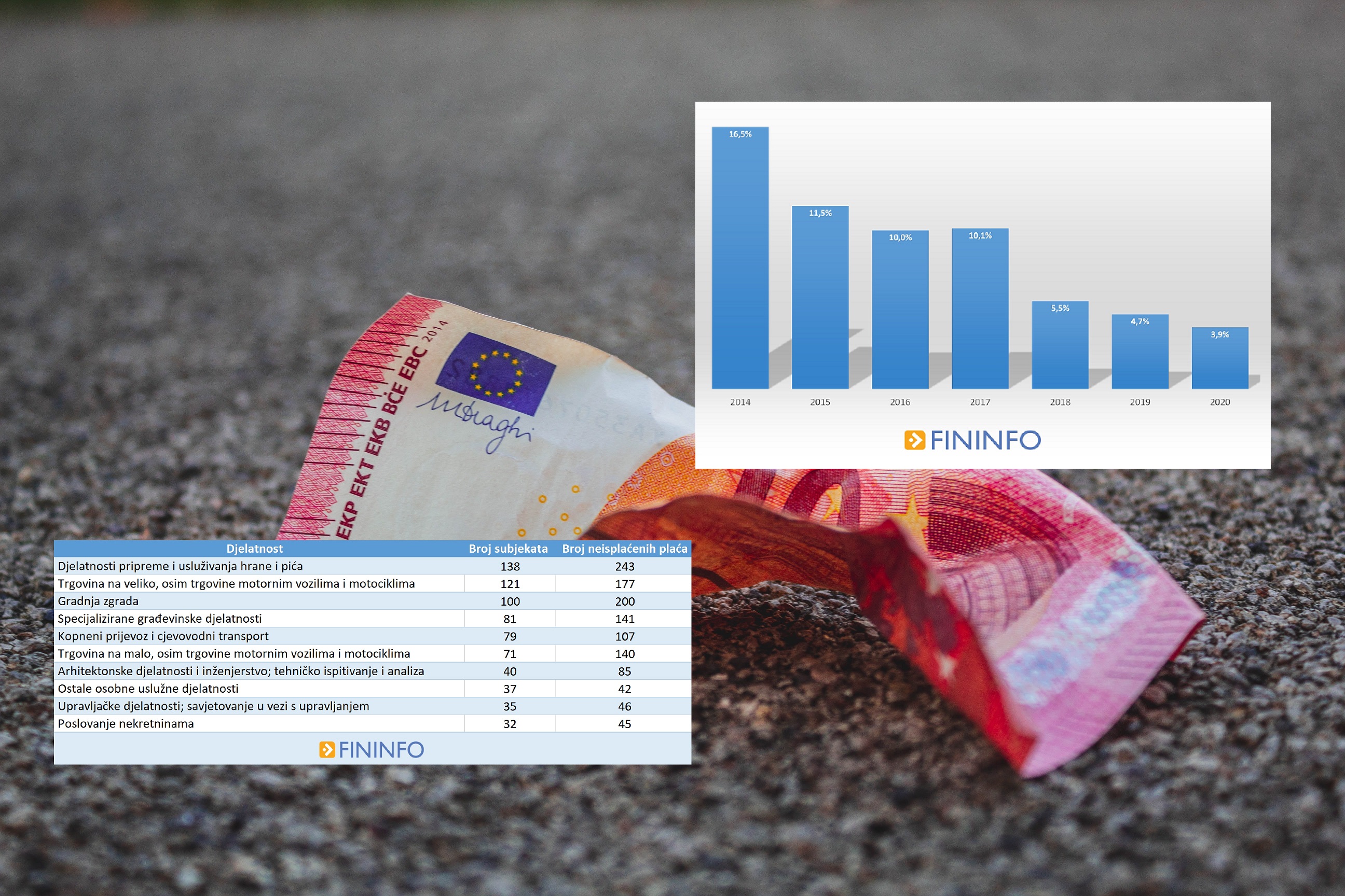 Poslodavci koji pripadaju ovim djelatnostima čine gotovo 62% ukupne liste neisplatitelja plaća te nisu isplatili plaće za 1.226 radnika za promatrano razdoblje. Sljedeća tablica prikazuje koliko neisplatitelja plaća pripada pojedinoj djelatnosti te za koliko radnika u tim djelatnostima nije isplaćeno plaća.