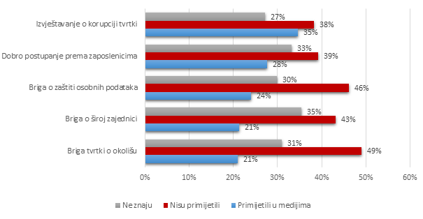 Koliko su građani Hrvatske upoznati s ovim pojmom, zamjećuju li teme vezane uz ESG u medijima te je li im pri kupnji proizvoda i usluga važno ulaže li tvrtka u provođenje i komunikaciju ESG-principa? Tvrtka Medianet provela je sredinom lipnja istraživanje opće populacije na uzorku od 1000 odraslih stanovnika Hrvatske. Za pojam ESG čuo je tek jedan od deset ispitanika. Mlađe dobne skupine (ponajviše od 25 do 34 godine) i ispitanici s visokim stupnjem obrazovanja u većem su udjelu čuli za pojam, u odnosu na ostale ispitanike, kao i stanovnici grada Zagreba, u odnosu na ostale regije. Za pojam su, očekivano, češće čuli ispitanici koji se informiraju iz medija, a osobito oni koji čitaju novine. Iako ispitanici nisu u velikoj mjeri upoznati s akronimom ESG, teme vezane uz održivo poslovanje te upravljanje po ESG principima građani ipak zapažaju u nešto većem postotku pa 21% od svih ispitanih navodi da u medijima primjećuje teme vezane uz zaštitu okoliša i brigu o zajednici, 28% je onih koji primjećuju dobro postupanje prema zaposlenicima u medijima, a 24% brigu o zaštiti privatnih podataka. Ispitanici su najosjetljiviji kad je u pitanju korupcija. 35% od 100% ispitanih zamjećuje izvještavanje o korupciji, što podrazumijeva podmićivanja javnih i državnih službenika, nezakonita zapošljavanja, nepotizam, pljačke imovine tvrtki, odnos prema zviždačima. Osim što najviše ispitanika od navedenih tema zamjećuje teme vezane uz korupciju, prilikom odabira proizvoda i usluga neke tvrtke, građani značajno veću važnost pridaju antikoruptivnoj politici proizvođača proizvoda kojeg kupuju, u odnosu na važnost koju pridaju brizi te tvrtke za okoliš, širu zajednicu, postupanju prema zaposlenicima i zaštiti privatnih podataka svojih klijenata.