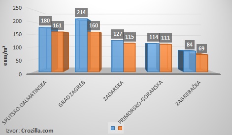 Cijene građevinskih zemljišta na području Splitsko–dalmatinske županije tijekom prošle godine iznosile su 161 euro po metru kvadratnom, a ta je cijena 10,4 posto niža nego prije četiri godine. Za „kvadrat“ zemljišta Zadarske županije tijekom 2014. godine u prosjeku se tražilo 115 eura, a ta je cijena 9,4 posto niža no 2010.godine. Prema podacima portala Crozilla.com najmanji pad cijena u tom razdoblju bilježe zemljišta na području Primorsko-goranske županije gdje razlika iznosi tek 2,7 posto, a za jedan se tamošnji metar kvadratni lani tražilo 111 eura. Statistike portala Crozilla.com pokazuju kako su lanjske cijene građevinskih zemljišta, u odnosu na one iz 2010.godine, najveći pad cijena zabilježile na području Zagreba kojima je cijena 25 posto niža, a za jedan se „kvadrat“ lani u prosjeku tražilo 160 eura. Velika je razlika zabilježena i u Zagrebačkoj županiji gdje su cijene pale preko 17 posto, a prosječna tražena cijena građevinskih zemljišta objavljenih lani na portalu Crozilla.com iznosila je 69 eura po metru kvadratnom.