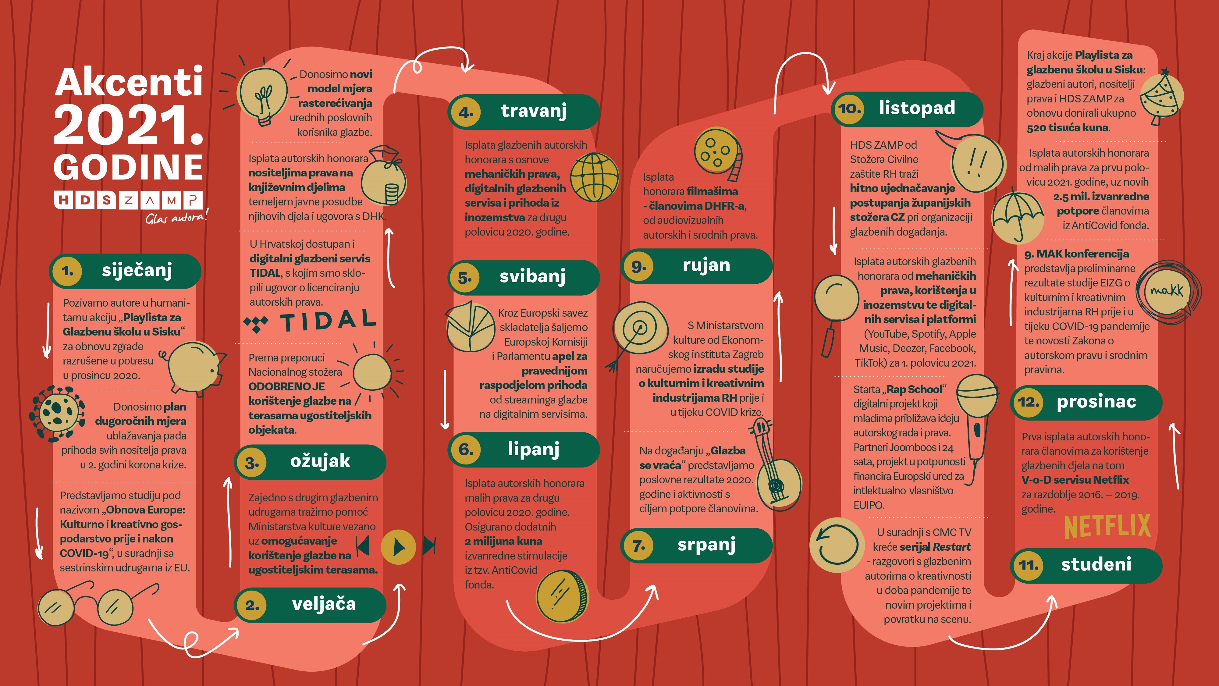 Na kraju još jedne godine otežanog poslovanja za glazbenike donosimo infografiku s najvažnijim akcentima poslovanja HDS ZAMP-a u 2021. godini.