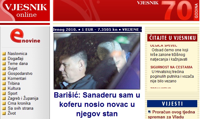 Vjesnikov je novinar objavio informaciju iz istrage u slučaju 'Fimi media', prema kojoj je bivši rizničar HDZ-a Mladen Barišić, dajući svoj iskaz Uskokovim istražiteljima, rekao da je bivšem premijeru Ivi Sanaderu u nekoliko navrata u njegovoj kući u Kozarčevoj te u središnjici HDZ-a u Zagrebu, u razdoblju od tri i pol godine, dao na ruke više od 30 milijuna kuna iz tvrtke Fimi media.