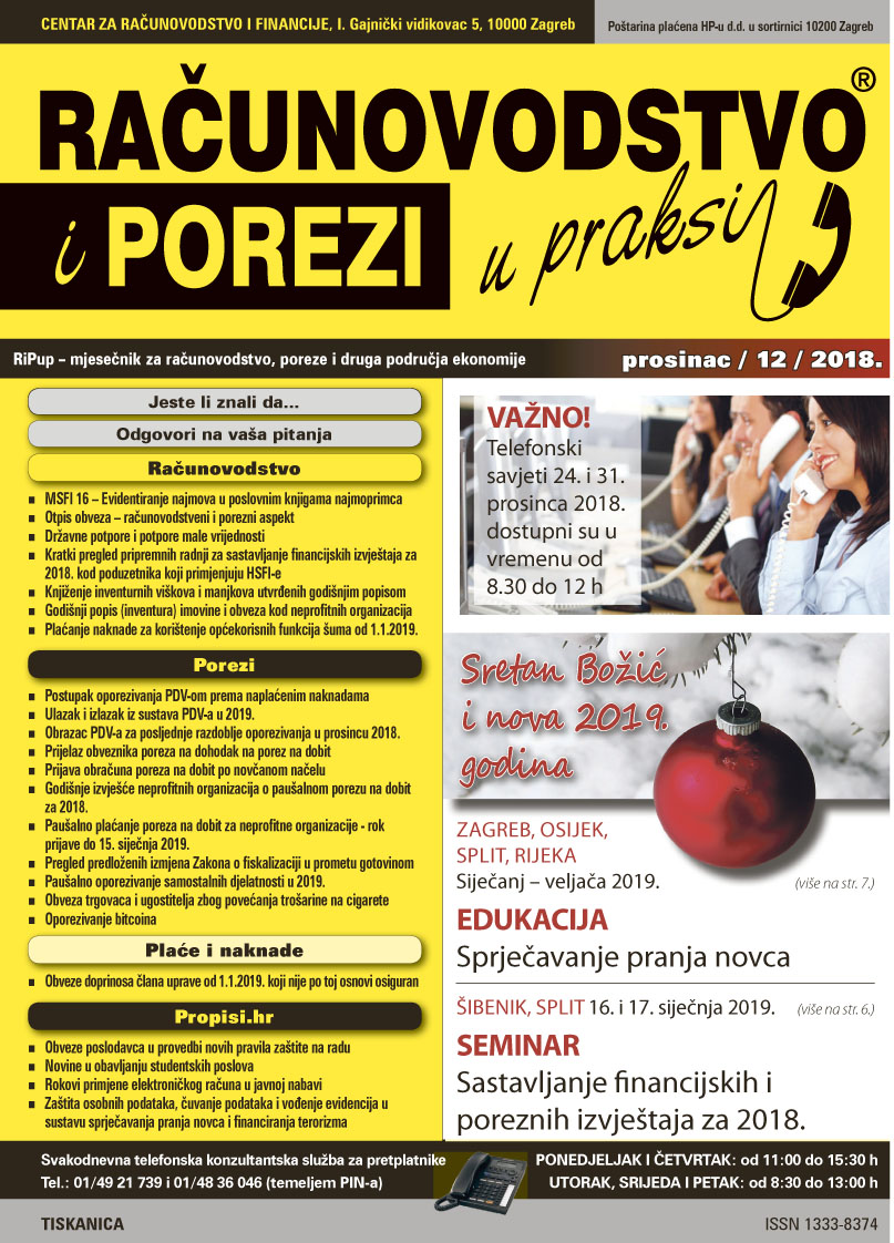 NOVI BROJ ČASOPISA RAČUNOVODSTVO I POREZI U PRAKSI BR. 12/2018