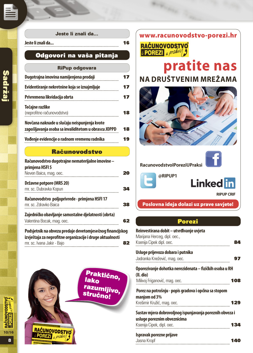 Mjesečnik Računovodstvo i porezi u praksi izlazi četrnaest godina i vjerujemo da smo opravdali povjerenje pretplatnika što i dokazuje velik broj čitatelja ovog praktičnog mjesečnika za računovođe, knjigovođe, revizore, porezne savjetnike i financijske djelatnike. Stoga vas pozivamo da se pretplatite na časopis čime dobivate pravo na besplatan pristup telefonskoj savjetničkoj službi, gdje tim eksperata svakodnevno odgovara na vaša pitanja iz područja računovodstva, poreza, plaća i naknada, radnih odnosa, trgovačkog prava.