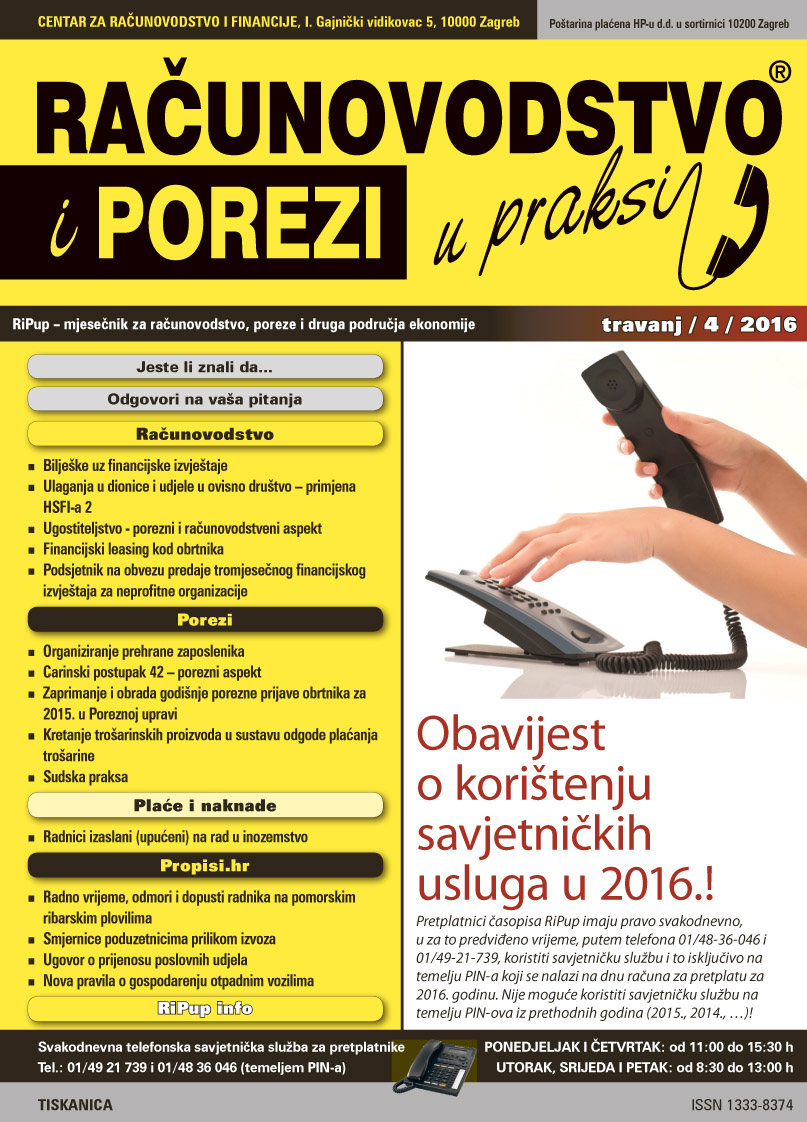 Mjesečnik Računovodstvo i porezi u praksi izlazi četrnaest godina i vjerujemo da smo opravdali povjerenje pretplatnika što i dokazuje velik broj čitatelja ovog praktičnog mjesečnika za računovođe, knjigovođe, revizore, porezne savjetnike i financijske djelatnike. Stoga vas pozivamo da se pretplatite na časopis čime dobivate pravo na besplatan pristup telefonskoj savjetničkoj službi, gdje tim eksperata svakodnevno odgovara na vaša pitanja iz područja računovodstva, poreza, plaća i naknada, radnih odnosa, trgovačkog prava.