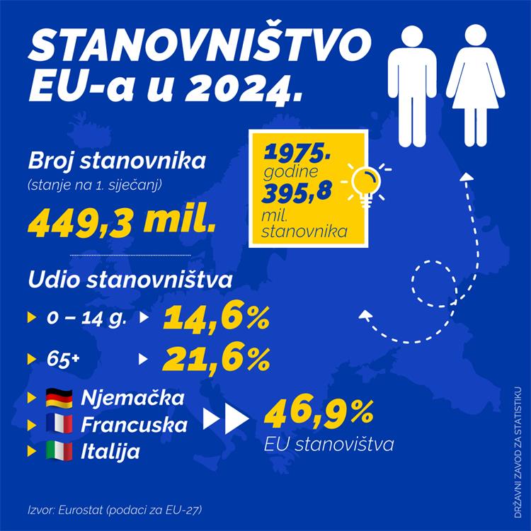 Kratak pregled „odrastanja“ Europske unije* možemo započeti s podacima o broju stanovnika koji je tijekom godina, uz pridruživanje novih članica, porastao na 449,3 milijuna stanovnika u 2024[1]. Gotovo polovicu njezinog ukupnog stanovništva, točnije 46,9% čine tri države članice - Njemačka, Francuska i Italija. Prema strukturi stanovništava, udio osoba u dobi od 0 do14 godina iznosi 14,6%, dok osobe starije od 65 godina čine 21,6%. Zanimljivo je spomenuti kako je 1975. broj stanovnika Europske unije bio za 53,5 milijuna manji, odnosno, u to je vrijeme EU imala 395,8 milijuna stanovnika.