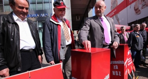 Blok umirovljenici zajedno je postavio na Trgu bana Jelačića škrabice pozivajući građane da ubace dobrovoljne novčane priloge i da se tako skuplja otpremnina za HDZ da ode s vlasti i za SDP da na vlast ne dođe.