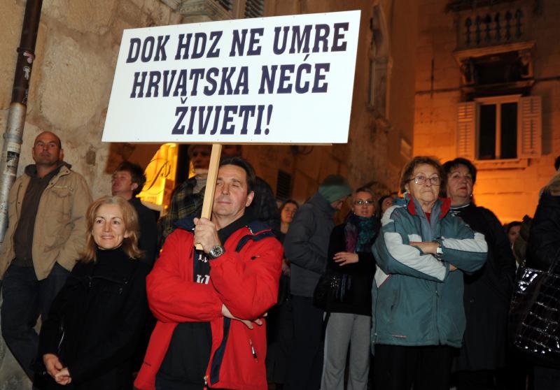 Više stotina prosvjednika okupljenih oko Facebookove grupe „Split protiv Vlade“, skupilo se večeras na Rivi, a zatim su mirnom šetnjom otišli najprije do Peristila i Pjace, a zatim ispred sjedišta županijskog splitsko-dalmatinskog HDZ-a u Sinjskoj ulici, gdje su poderali jednometarski portret bivšega premijera Ive Sanadera.