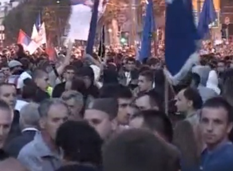 Izgredi su počeli pred kraj skupa na prostoru ispred Doma Narodne skupštine, kada su demonstranti policiju gađali kamenjem i bocama uzvikujući "idite na Kosovo". Nakon reakcije policije sukobi su se premjestili u okolne ulice u užem središtu grada, pri čemu je jedna skupina demonstranata krenula ka ulici Kneza Miloša u kojoj se nalaze veleposlanstva, u čemu ih je policija spriječila.