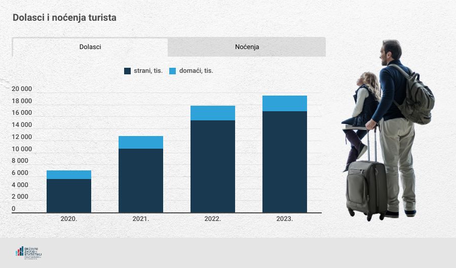 U 2023. u komercijalnim smještajnim objektima u Republici Hrvatskoj ostvareno je 92,4 milijuna noćenja turista, što je za 2,6% više nego u 2022., te 19,5 milijuna njihovih dolazaka, što je u odnosu na prethodnu godinu porast od 9,7%. A kako je bilo 1980., kao godine kada se počeo obilježavati Svjetski dan turizma? Tada je ostvareno gotovo upola manje noćenja nego u 2023., točnije 53,6 milijuna, i samo 7,9 milijuna dolazaka, što je za gotovo 12 milijuna manje dolazaka nego što pokazuju najnoviji podaci.