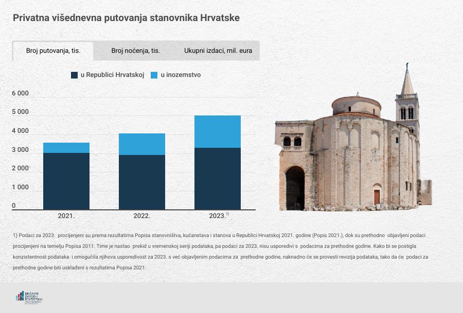 Stanovnici Hrvatske u dobi od 15 i više godina vole putovati, što potvrđuje i podatak da su u 2023. ostvarili ukupno 5,0 milijuna privatnih višednevnih putovanja, a od toga 65,4% u Hrvatskoj, a 34,6% u inozemstvu.