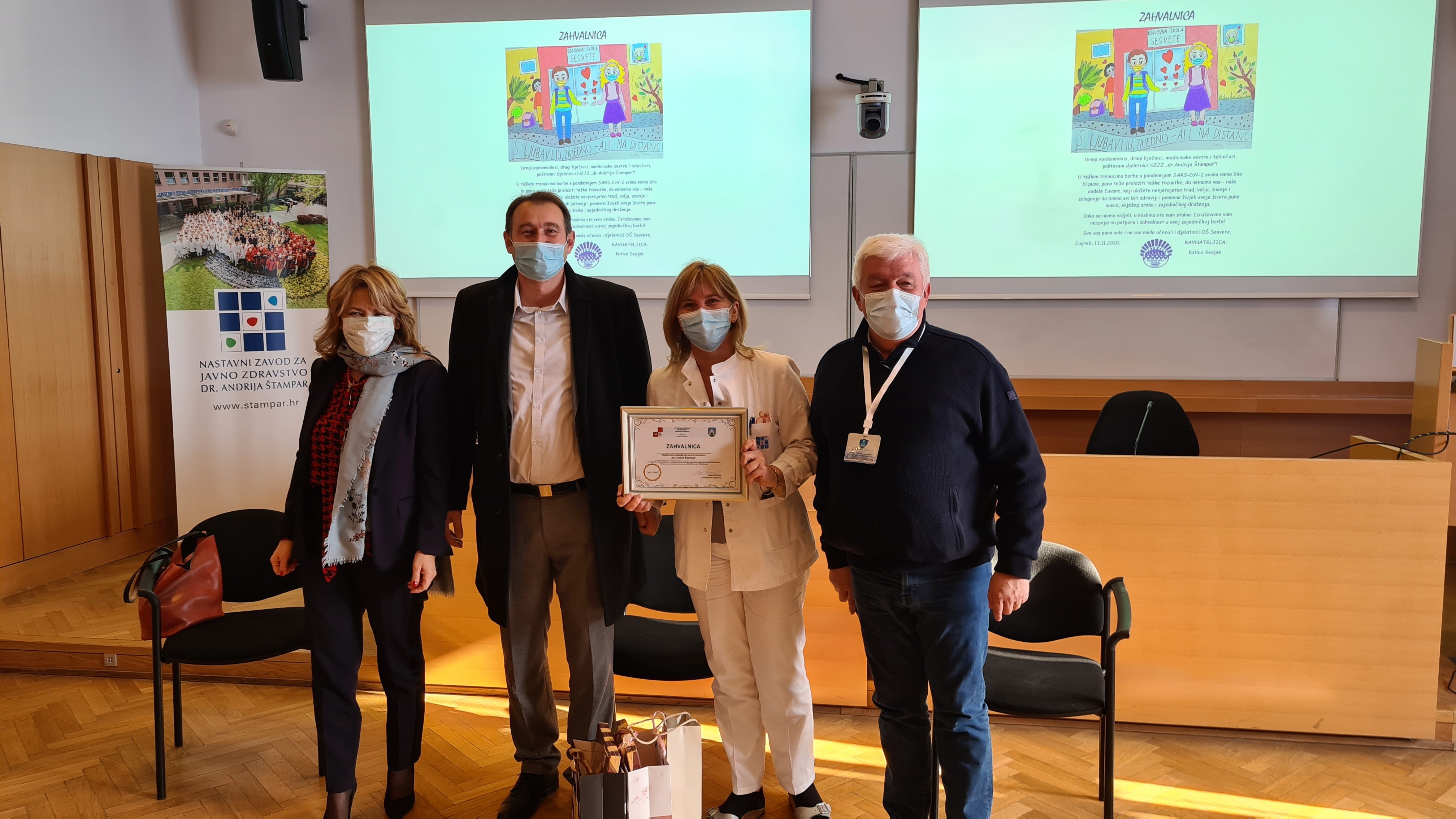 Predsjednik Udruge ravnatelja osnovnih škola Grada Zagreba, prof. Josip Petrović, uručio je djelatnicima Nastavnog zavoda za javno zdravstvo „Dr. Andrija Štampar“ zahvalnicu za sav dosadašnji rad i trud. Ovaj znak zahvalnosti su primili liječnici, medicinske sestre i tehničari te ostali djelatnici Zavoda, koji su u ovoj godini svojim nesebičnim angažmanom uvelike doprinijeli u borbi protiv koronavirusa.