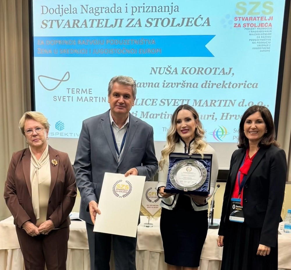 Još jedno priznanje stiglo je u Terme Sveti Martin. Glavna izvršna direktorica gđa Nuša Korotaj, dobitnica je međunarodne nagrade i priznanja “Stvaratelji za stoljeća“ za doprinos razvoju poduzetništva žena u Srednjoj i Jugoistočnoj Europi.