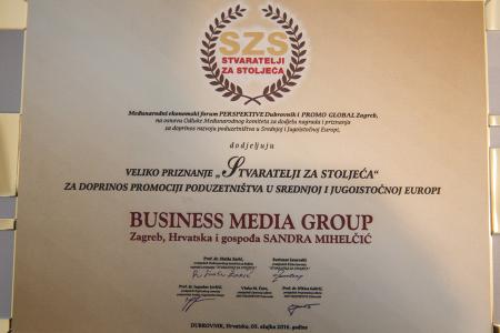 Medijska grupa Business Media Group, izdavač časopisa Poslovni savjetnik u subotu, 5.3.2016. u dubrovačkom hotelu Sheraton, dobila prestižno međunarodno priznanje "Stvaratelji za stoljeća" za izniman doprinos promociji poduzetništva u jugoistočnoj Europi. U sklopu svečanosti održala se i međunarodna konferencija poduzetnika "300 najboljih" koja je okupila 250 sudionika iz 13 europskih zemalja. U ime Business Media Group-e nagradu je primila Sandra Mihelčić, vlasnica i direktorica.
