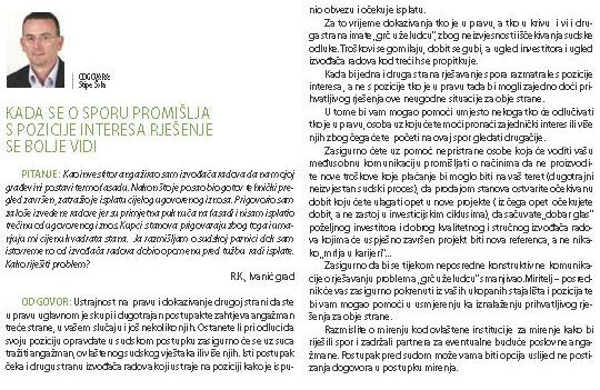 Ustrajnost na pravu i dokazivanje drugoj strani da ste u pravu uglavnom je skupi i dugotrajan postupak te zahtjeva angažman treće strane, u vašem slučaju i još nekoliko njih. Ostanete li pri odluci da svoju poziciju opravdate u sudskom postupku zasigurno će se uz suca tražiti angažman, ovlaštenog sudskog vještaka ili više njih. Isti postupak čeka i drugu stranu izvođača radova koji ustraje na poziciji kako je ispunio obvezu i očekuje isplatu.