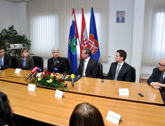 Premijerka Jadranka Kosor potpisala je s gradonačelnikom Novske Antunom Vidakovićem ugovor o darovanju zemljišta za poduzetničku zonu Jug u Novskoj, a potom je obišla pogone tvornice namještaja Trokut.