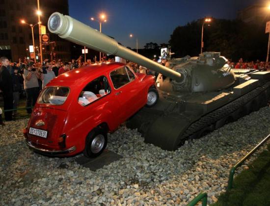 U sklopu obilježavanja dana osječkih branitelja, na križanju osječke Vukovarske i Trpimirove ulice, sinoć je otkrivena umjetnička instalacija, u spomen na crvenog "fiću", kojeg je 27. lipnja 1991. godine, pregazio tenk tzv.