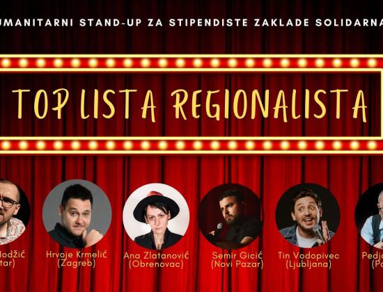 Vodeća imena regionalne stand-up komedije nastupit će u subotu 7. listopada od 19 sati u CineStaru u Branimir centru u Zagrebu na drugoj po redu humanitarnoj večeri smijeha pod nazivom “Top lista regionalista”.