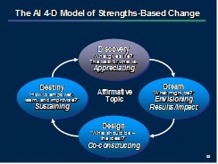 The Appreciative Inquiry 4-D cycle unleashes the energy of the positive core for transformation and sustainable success. (see illustration)