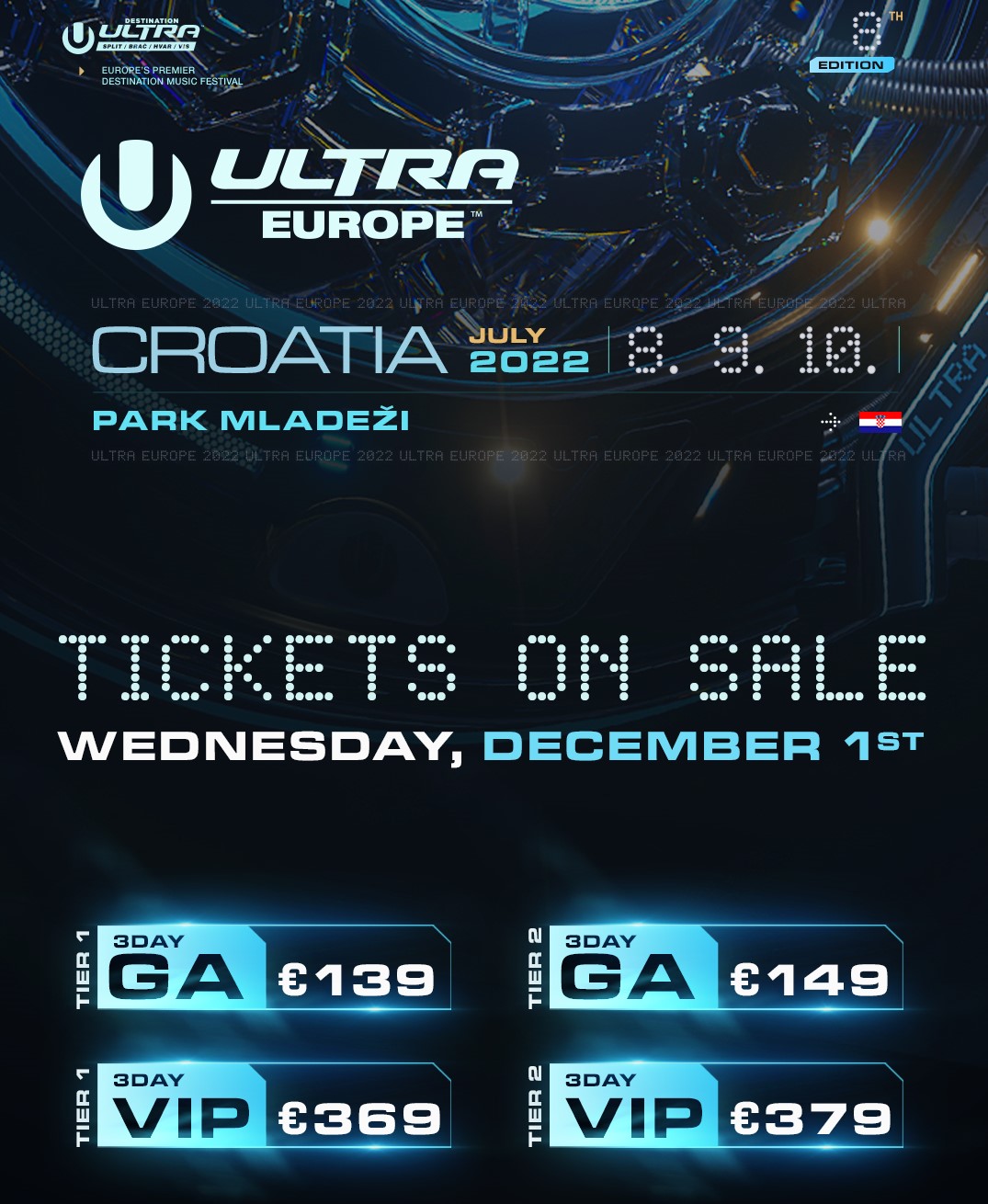 Ograničeni broj ulaznica faze TIER 1 kreće u prodaju danas, a sve se informacije mogu pronaći na službenoj stranici https://ultraeurope.com/tickets/festival/. Početna cijena za trodnevnu GA ulaznicu iznosi 139€ dok će svi oni koji su spremni na posebno VIP iskustvo morati izdvojiti 369€. Potpuni ULTRA doživljaj, koji predstavlja sedmodnevno putovanje na četiri čarobne lokacije i 8 jedinstvenih party stanica, omogućuju ultimativne Destination ULTRA Europe ulaznice, a od danas se mogu osigurati po cijeni od 339 eura. Prvih 250 fanova koji kupe ove ulaznice dobit će ekskluzivnu pozivnicu za ULTRA Europe Sunset Family Dinner na otoku Visu, koja će se održati prije početka završne zabave u čarobnoj tvrđavi Fort George. Za sve one koji će na osmo izdanje festivala doći u društvu prijatelja i koji imaju ULTRA putovnicu, omogućene su i grupne ulaznice pa će na 5 kupljenih, dobiti i šestu.