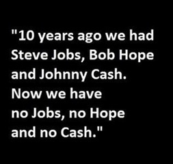 "10 years agor we had Steve Jobs, Bob Hope and Johnny Cash. Now we have no Jobs, no Hope and no Cash."