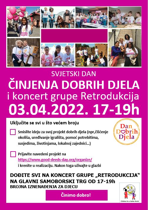 Svjetski dan činjenja dobrih djela održat će se po prvi put u Hrvatskoj u nedjelju 3. travnja u organizaciji Udruge Djeca za bolji svijet iz Samobora koja je ovom prilikom organizirala i koncert grupe Retrodukcija na glavnom samoborskom trgu. Koncert će se održati nakon brojnih volonterskih aktivnost u kojima će sudjelovati brojne druge udruge, ali i pojedinci koji žele doprinijeti svojoj lokalnoj zajednici volonterskim radom.