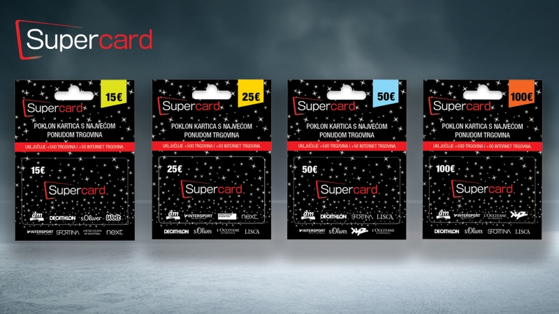 SuperCard omogućuje da jednostavno pošaljete zaposleniku ili poslovnom partneru na email kupljeni kod u odabranoj vrijednosti uz Vaš osobni pozdrav. Primatelj zatim odabire u kojoj online trgovini želi iskoristiti kod i čarolija može započeti! Ovo je jedina poklon kartica s kojom je moguće kupovati u različitim vrijednostima i koristi se u više od 500 fizičkih i 50 internet trgovina. Dolazi u 4 različita motiva: Super E, SuperCard White, SuperCard Black i SuperCard Eco i može se iskoristiti kod partnera kao Crystal Vision-Swarovski, Elysees, Pivovara Medvedgrad, DM, Intersport, Decathlon, Head, Superdry, BabyCentar, Froddo, Amazinga i mnogi drugi.