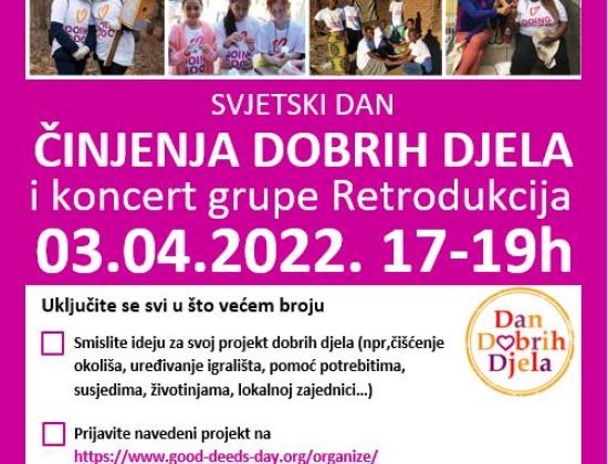Svjetski dan činjenja dobrih djela održat će se po prvi put u Hrvatskoj u nedjelju 3. travnja u organizaciji Udruge Djeca za bolji svijet iz Samobora koja je ovom prilikom organizirala i koncert grupe Retrodukcija na glavnom samoborskom trgu.