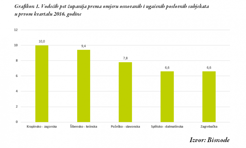 Promatrajući te podatke na razini županija, najviše se ističe Krapinsko – zagorska županija koja ima najpovoljniji omjer ugašenih i osnovanih poduzeća. Tamo je u prva tri mjeseca ove godine na svako ugašeno poduzeća osnivano 10 novih. Slično je bilo i u Šibensko – kninskoj gdje se na jedno ugašeno poduzeće osnivalo 9,4 novih. Ističu se još i Požeško – slavonska, Splitsko – dalmatinska te Zagrebačka županija. Analiza županija pokazuje kako su samo dvije županije imale više ugašenih od osnovanih poslovnih subjekata tijekom prvog kvartala 2016. godine- Bjelovarsko – bilogorska i Virovitičko – podravska županija. U istom kvartalu prethodne godine niti jedna županija nije imala negativan odnos osnovanih i ugašenih poduzeća, dok je po najpovoljnijem omjeru osnovanih i ugašenih prednjačila Ličko – senjska županija.