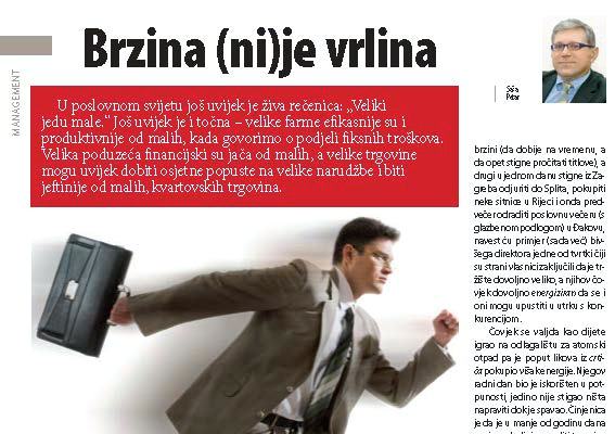 Posljednjih je godina sve aktualnija rečenica: „Brzi jedu spore.“ Brojni su tekstovi napisani o tome je li bolje biti prvi na tržištu ili je, u nekim situacijama, bolje na tržište doći drugi, treći ili koji već ... Što se događa kada su manageri brzi? Ili spori? Mislim da nema pravila i da svaki pojedinac (vlasnik poduzeća ili manager) donosi odluke brzinom za koju je sposoban. Ipak, što se događa ako njihovi timovi ne mogu biti brzi poput njih? Ili, ako su spori u provođenju njihovih ideja i naloga? Što se događa kada su manageri prebrzi ili prespori za svoje suradnike? Ili tržište...