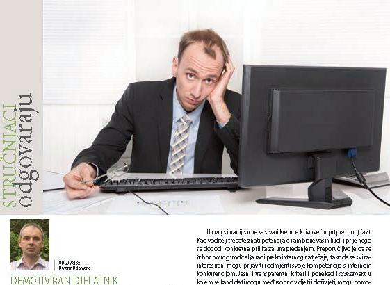 Kako vratiti motivaciju kod radnika koji smatra da je zakinut unaprjeđenjem drugog kolege na mjesto na koje je pretendirao. Nije li normalno očekivati od svih zaposlenika da budu usredotočeni na posao neovisno o situacijama koje se odvijaju unutar organizacije?