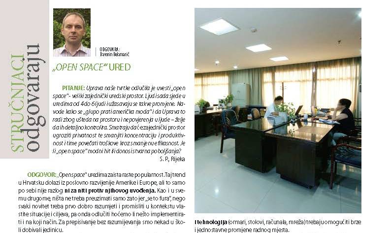 „Open space“ uredima zaista raste popularnost. Taj trend u Hrvatsku dolazi iz poslovno razvijenije Amerike i Europe, ali to samo po sebi nije razlog ni za niti protiv njihovog uvođenja. Kao i u svemu drugome, ništa ne treba preuzimati samo zato jer „se to fura“, nego svaki novitet treba prvo dobro razumjeti i promisliti u kontekstu vlastite situacije i ciljeva, pa onda odlučiti hoćemo li nešto implementirati i na koji način. Za prepisivanje bez razumijevanja smo nekad u školi dobivali jedinicu.