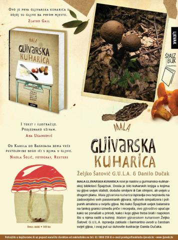 MALA GLJIVARSKA KUHARICA novi je naslov u gurmansko-kulinarskoj biblioteci Špajzbuk. Dosta je bilo kuharskih knjiga u kojima su gljive uvijek statisti, doduše omiljeni ili čak otmjeni, ali uvijek u drugom planu. Mala gljivarska kuharica ispravlja ovu nepravdu na zadovoljstvo svih pasioniranih gljivara, njihovih simpatizera i potpunih amatera u svijetu gljiva. No kako Špajzbuk uvijek balansira na tankoj granici između priče i recepata, ovo gljivoštivo upućuje kako se ponašati u prirodi, kako i koje gljive treba brati i napokon što s njima raditi u kuhinji. Malom gljivarskom kuharicom Željko Šatović G.u.l.a. ispravlja zablude i šarmantno uvodi u čaroban svijet gljiva, i ovaj put uz duhovite ilustracije Danila Dučaka. (PS)