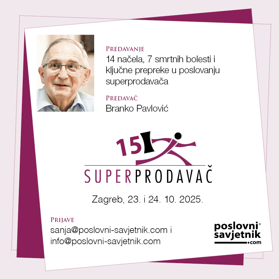 U zagrebačkom kongresnom centru Antunović, 23. i 24.10.2025. održat će se JUBILARNA petnaesta po redu prodajna konferencija Superprodavač, te će se dodijeliti godišnje nagrade B2B Superprodavač godine. Organizator je portal Poslovni savjetnik, konferencija će okupiti oko 150 sudionika.