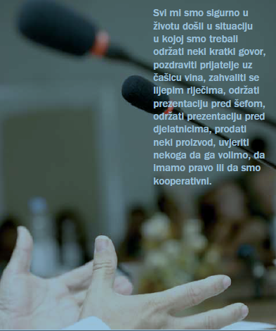 Svi mi smo sigurno u životu došli u situaciju u kojoj smo trebali održati neki kratki govor, pozdraviti prijatelje uz čašicu vina, zahvaliti se lijepim riječima, održati prezentaciju pred šefom, održati prezentaciju pred djelatnicima, prodati neki proizvod, uvjeriti nekoga da ga volimo, da imamo pravo ili da smo kooperativni.
