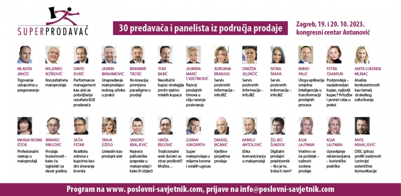 Poslovna konferencija SUPERPRODAVAČ 2023. dovodi čak 30 predavača, panelista i laureata! Zagreb, 19. i 20.10.2023. Karte su u prodaji! Učite od najboljih prodajnih konzultanata-kako prodavati kupcima budućnosti na najvećoj, trinaestoj po redu, prodajnoj konferenciji. Prijave na info@poslovni-savjetnik.com, tel. 01 49 21 737...jer prodaja je vještina!