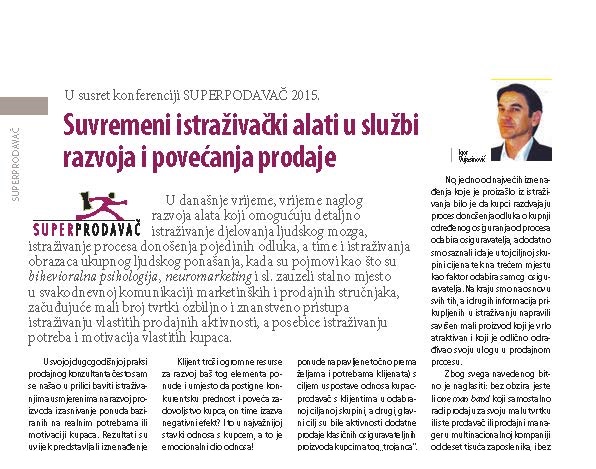 U svojoj dugogodišnjoj praksi prodajnog konzultanta često sam se našao u prilici baviti istraživa­njima usmjerenima na razvoj pro­izvoda i zasnivanje ponuda bazi­ranih na realnim potrebama ili motivaciji kupaca. Rezultati su uvijek predstavljali iznenađenje za klijenta, a ponekad su dava­li i znatno drugačiju sliku kupca od one koju su prodavači imali o njima, tako da su se neke „svete krave“ u branši, tj. neki elementi koje se nitko ne bi usudio dove­sti u pitanje, pokazale nevažnima ili čak nepoželjnima u prodajnom pristupu.