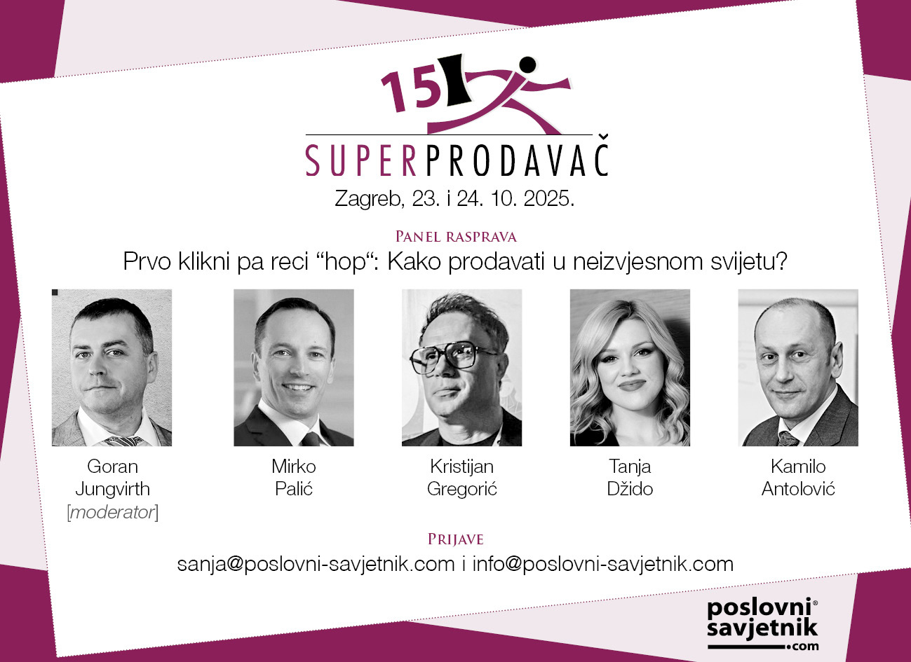 U zagrebačkom kongresnom centru Antunović 23. i 24.10.2025. održat će se jubilarna, petnaesta po redu konferencija Superprodavač, te će se dodijeliti godišnje nagrade „B2B Superprodavač“ godine. Organizator je portal Poslovni savjetnik.
