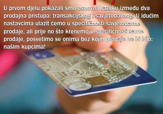 Tajna uspješne prodaje glasi: moramo osigurati da prodajemo ono što kupci žele kupiti. Zvuči vrlo jednostavno, ali praksa iz prodajnih organizacija pokazuje sasvim suprotno: većina prodavača ne razumije što kupci od njih kupuju. Upitate li ljude iz prodaje što to kupci od njih kupuju, ovisno o branši u kojoj rade, odgovori će biti usmjereni na njihove proizvode: bušilice,računala, fondove, časopise, mobitele, oglasni prostor itd. Pri tome nisu ni najmanje svjesni koliko su daleko od istine. Kupci u pravilu vrlo malo mare za kupovinu ovih proizvoda/usluga koje im prodavači nude! Pa što onda kupuju, sigurno se pitate?(PS/Z.R.)